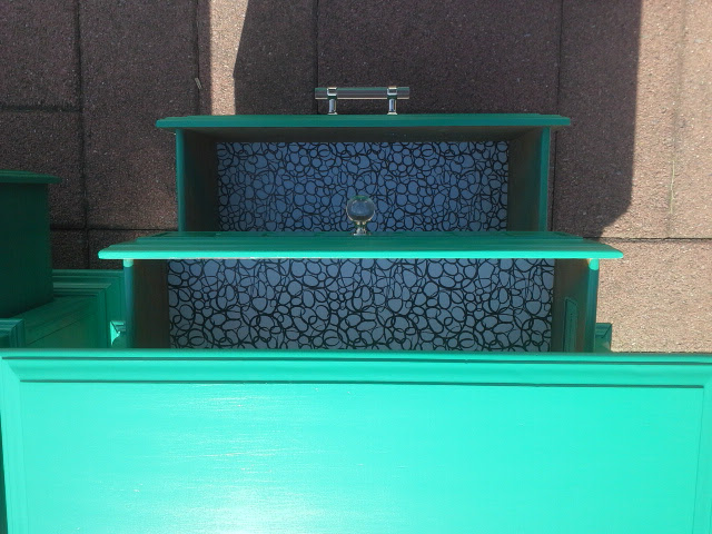 I love painting like this because I can have complete, creative freedom. The base color is a deep teal chalk paint and a blended in lighter turquoise, I then layered on the accent green colors. Distressed it and gave it multiple coats of poly, sanding between coats as always for a super soft smoothness.
